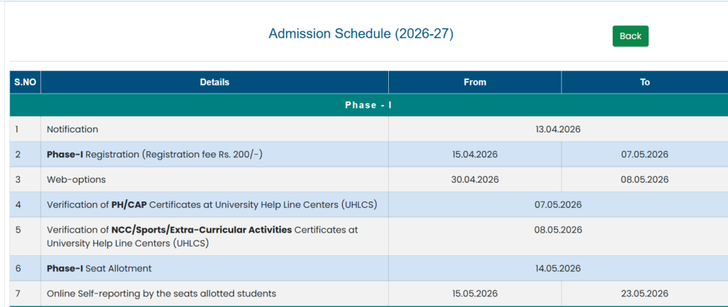 ఫేజ్-1: రిజిస్ట్రేషన్ 15.04.2026 నుంచి 07.05.2026 వరకు. వెబ్ ఆప్షన్లు 30.04.2026 నుంచి 08.05.2026. సీట్ అలాట్మెంట్ 14.05.2026. సెల్ఫ్ రిపోర్టింగ్ 15.05.2026 నుంచి 23.05.2026.
