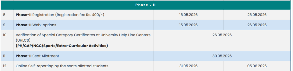 ఫేజ్-2: రిజిస్ట్రేషన్ 15.05.2026 నుంచి 25.05.2026. వెబ్ ఆప్షన్లు 15.05.2026 నుంచి 26.05.2026. సీట్ అలాట్మెంట్ 30.05.2026. సెల్ఫ్ రిపోర్టింగ్ 31.05.2026 నుంచి 05.06.2026.