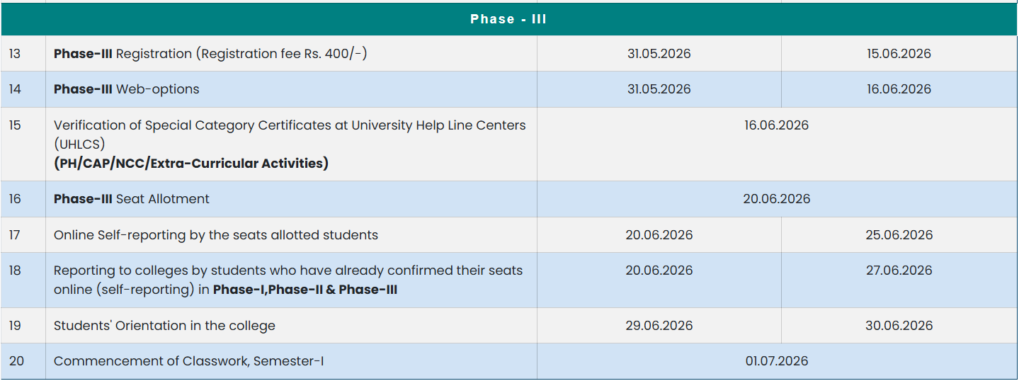 ఫేజ్-3: రిజిస్ట్రేషన్ 31.05.2026 నుంచి 15.06.2026. వెబ్ ఆప్షన్లు 31.05.2026 నుంచి 16.06.2026. సీట్ అలాట్మెంట్ 20.06.2026. సెల్ఫ్ రిపోర్టింగ్ 20.06.2026 నుంచి 25.06.2026.