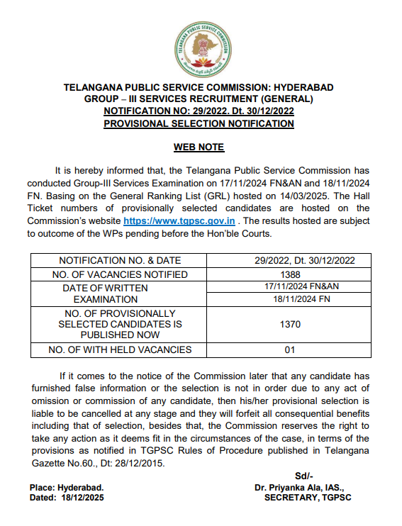 తెలంగాణ పబ్లిక్ సర్వీస్ కమిషన్ (టీజీపీఎస్‌సీ) డిసెంబర్ 18, 2025న గ్రూప్-3 సర్వీసెస్ (జనరల్ రిక్రూట్‌మెంట్) నోటిఫికేషన్ నం. 29/2022 కింద తాత్కాలిక ఎంపిక నోటిఫికేషన్ను విడుదల చేసింది. ఇందులో మొత్తం 1388 ఖాళీలకు (నోటిఫైడ్ వేకెన్సీస్) 1370 మంది అభ్యర్థులను తాత్కాలికంగా ఎంపిక చేశారు. ఒక ఖాళీ విత్‌హెల్డ్‌గా ఉంది.